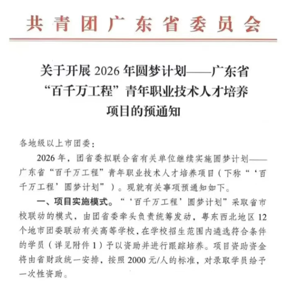 导读: 2026 年广东 “百千万工程” 圆梦计划官方预通知已发布!符合条件者每人可申领2000 元一次性补贴,全省拟资助约8500名粤东粤西粤北地区青年,计划 5-6 月开启申报,快来对照条件...