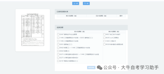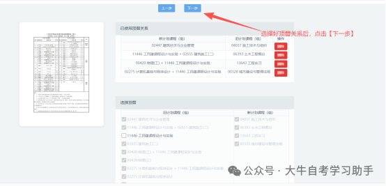 顶替说明:考生若需进行顶替,则需要勾选旧计划课程(组)中任意两门及以上且学分大于7的科目,以及勾选新计划课程(组)中的科目。