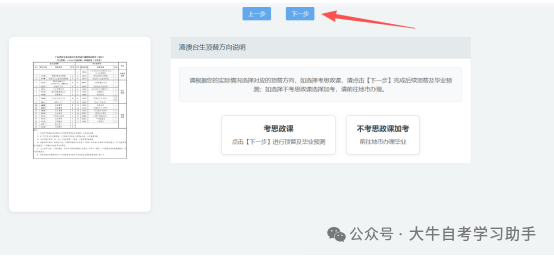 注:如您是港澳台考生,请根据自身情况选择对应的顶替方向。如选择不考思政课,选择加考进行顶替课程及预测,请前往地市办理。如选择考思政课,则点击【下一步】。点击【下一步】则默认按照考思政课的顶替方向进行顶替。