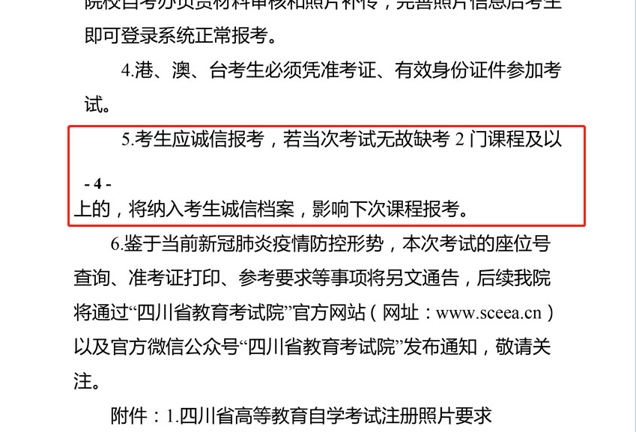 广东省教育院指出:自考考生缺考率较高,因此对无故缺考考生实行诚信考试记录,记入诚信档案,对多次无故缺考考生将实施限制报考课次等措施。